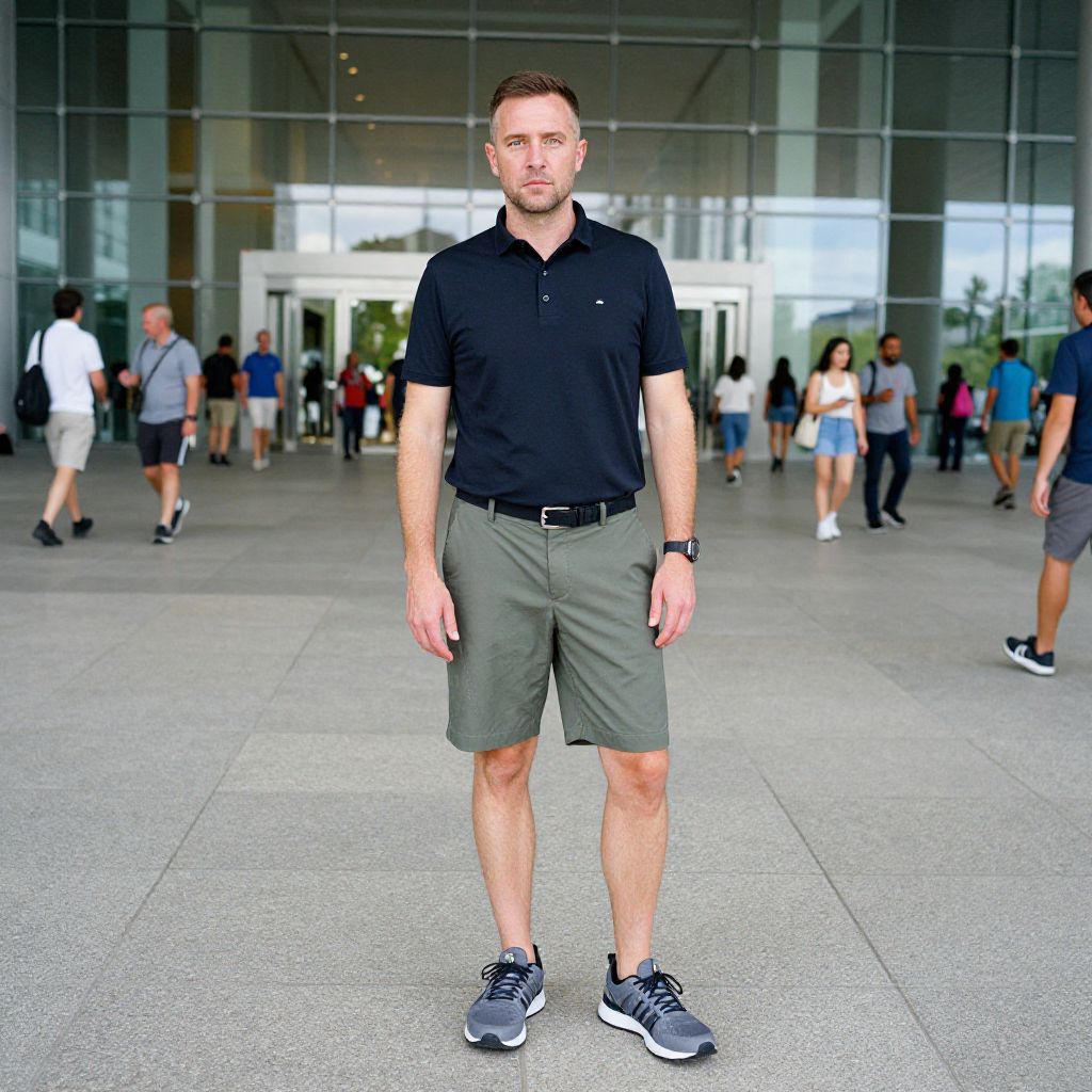 A man, dark navy golf polo, olive green tech shorts, gray performance sneakers, modern glass facade, bustling with travelers, kodak sp analog photo, relaxed expression Man has masculine face and piercing eyes