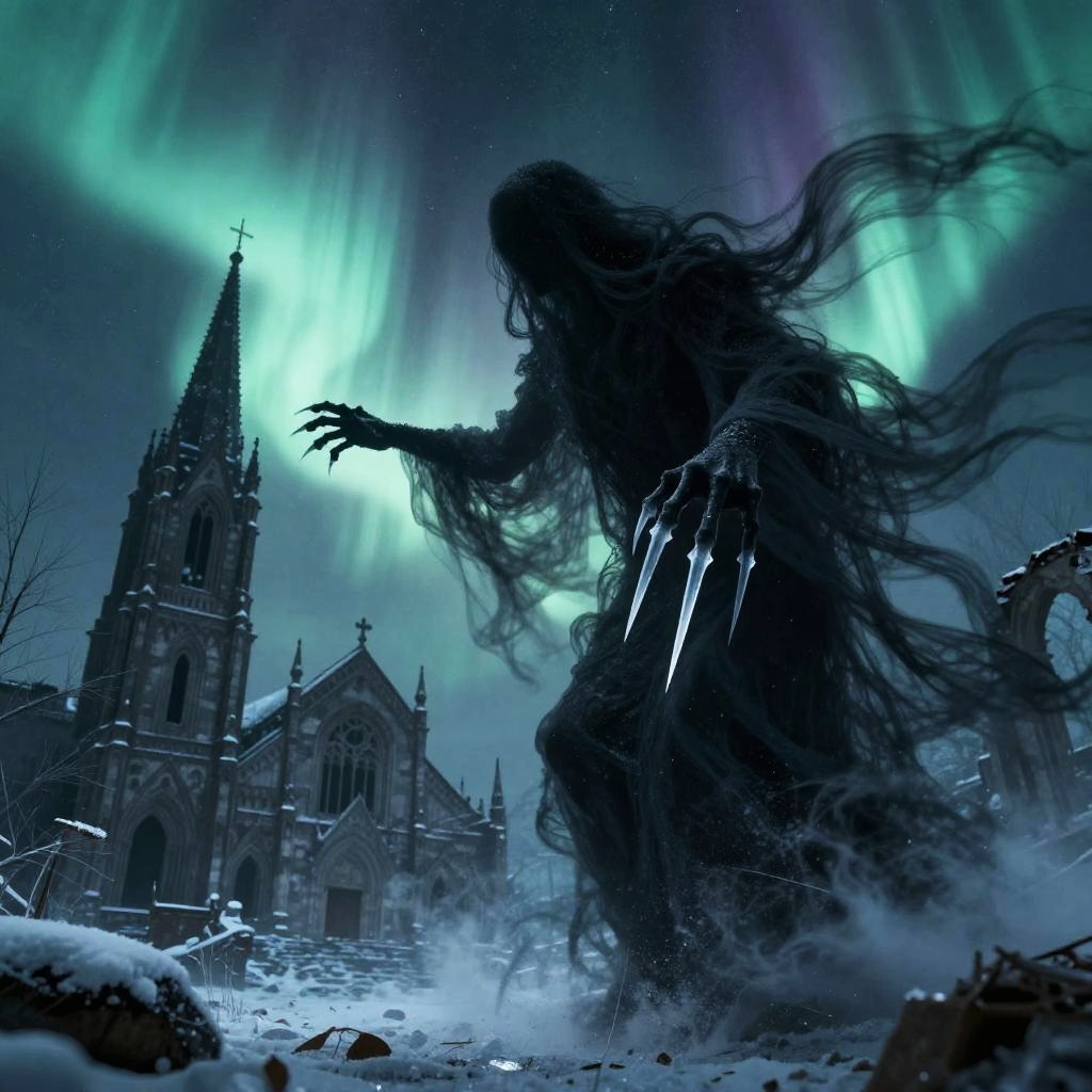 A spectral wraith with long, needle-like translucent claws reaching forward, its form dissolving into echoing veils of molten shadow, moving through a frozen aurora above a ruined cathedral.