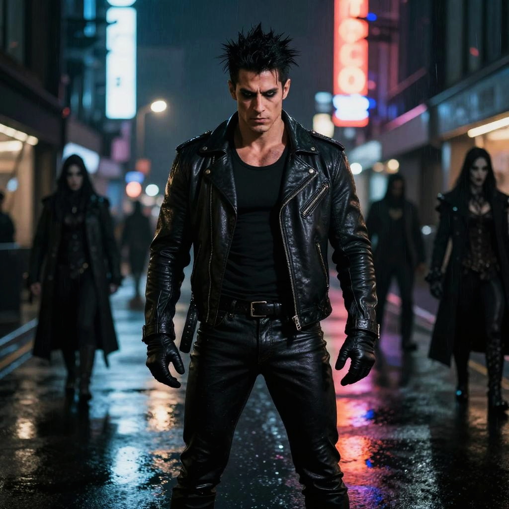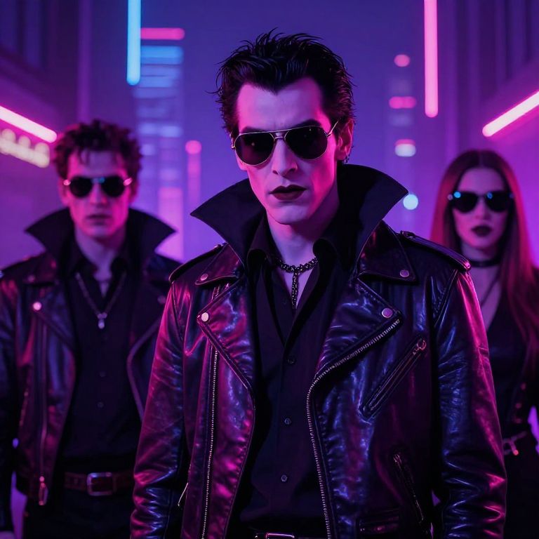 80s vampire aesthetic, neon-lit cityscape with gothic vampires wearing leather jackets and mirrored sunglasses, synthwave vibes, moody purple and pink hues, cinematic lighting