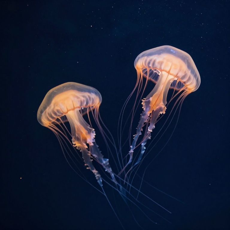 Two ethereal jellyfish gracefully drift through a deep midnight-blue ocean, their translucent bodies glowing softly with warm amber hues, while delicate tendrils trail behind them, leaving shimmering streaks of light and stardust against the dark, star-speckled backdrop.