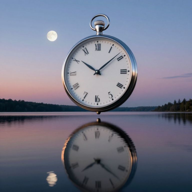 A large silver pocket watch with Roman numerals hovers above a tranquil lake at twilight, reflecting perfectly on the water's surface. The full moon shines in the pastel-colored sky, creating a serene and dreamlike atmosphere. The peaceful natural landscape with distant tree-lined shore contrasts with the surreal floating timepiece, symbolizing the passage of time and blending reality with fantasy.