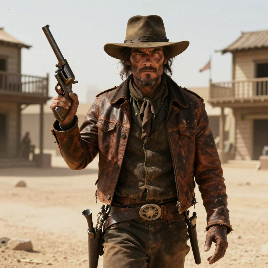 Photorealistic digital art of a rugged, bearded man in a brown leather jacket and hat, holding a revolver, standing in a dusty, Western