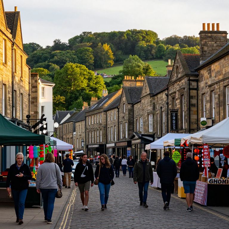 Stroud town center at golden hour, historic stone buildings with lush green hills in the background, busy street market with colorful stalls, vibrant community atmosphere, soft natural lighting, detailed textures on cobblestone streets, cinematic view