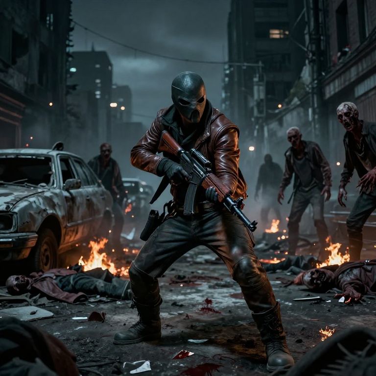 A lone masked scavenger stalking the streets of a post-apocalypse city, leather outfit, Surrounded by zombies, holding an assault rifle, dynamic pose, fighting, battle, combat, destroyed vehicles, destroyed buildings, night, scary, eerie, horror, fires, bodies on the ground, blood