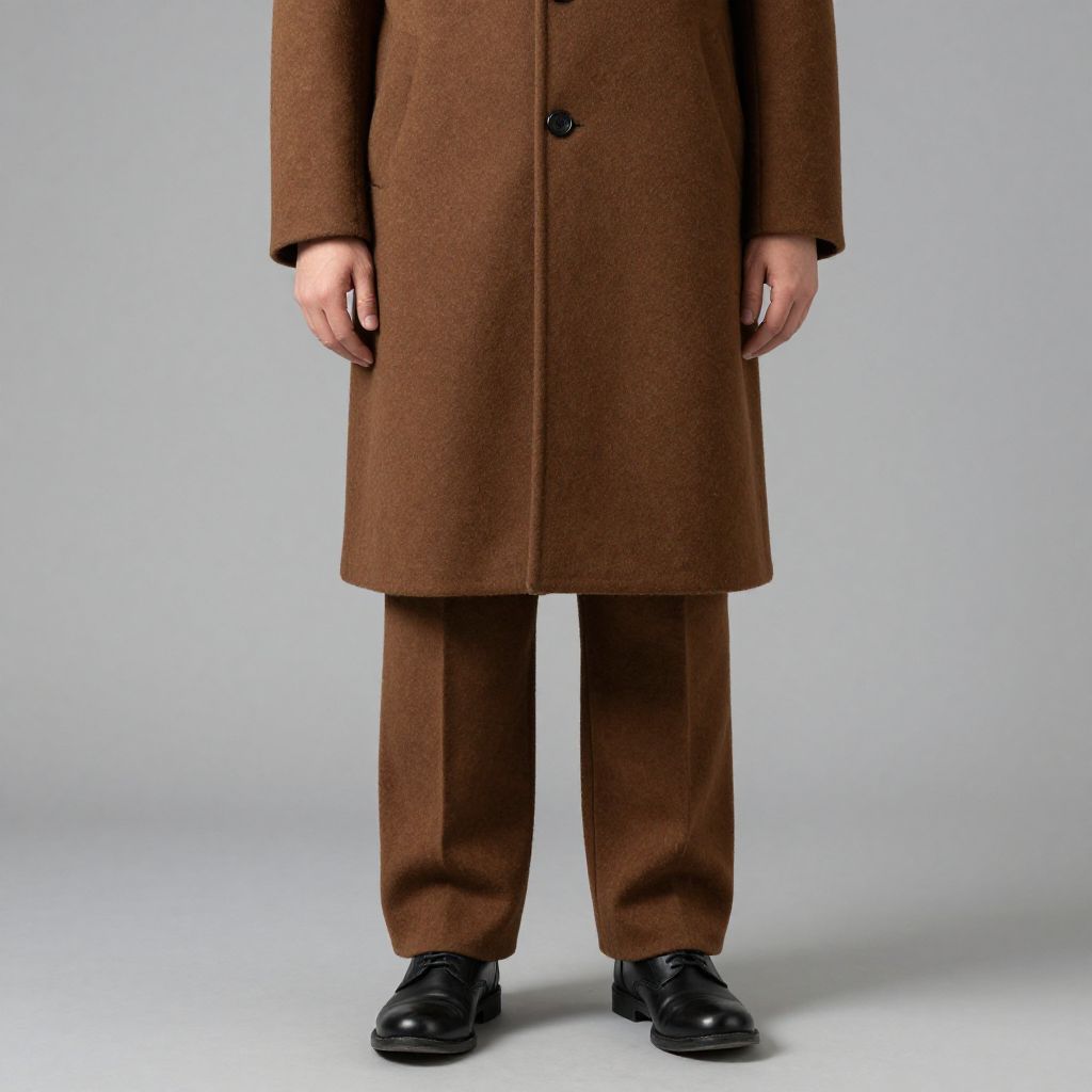 Photograph of a person standing against a plain, light gray background. The subject is wearing a brown, long, double-breasted wool coat with black buttons, and matching brown trousers. Their hands are relaxed by their sides, with fingers slightly curled. They are also wearing black, polished leather shoes. The coat's texture appears slightly rough, while the trousers are smooth. The person's face is not visible, focusing attention on the coat and trousers. The overall style is minimalist and formal.