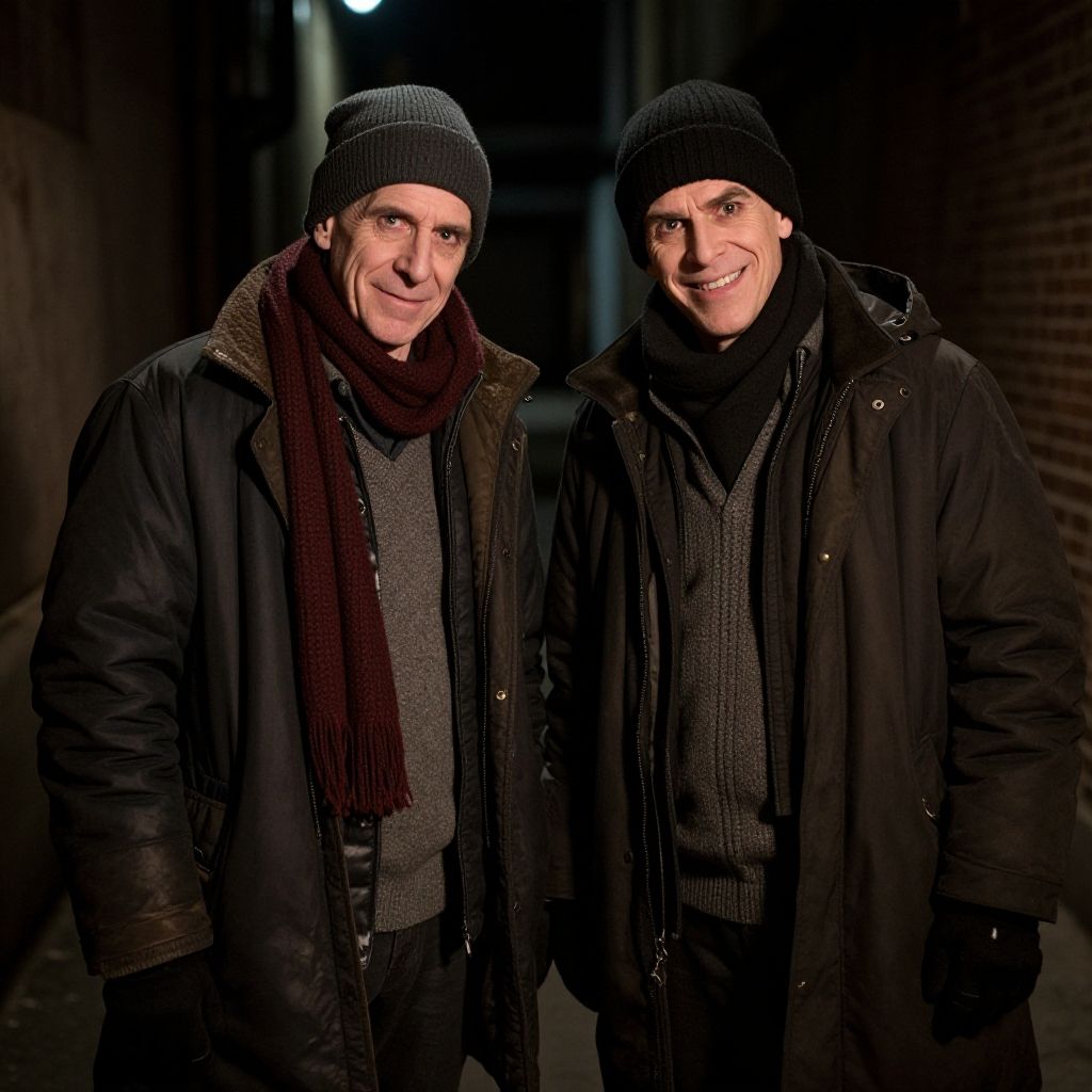 Photograph of two smiling men in winter attire, black knit hats, dark coats, and scarves, standing closely in a dimly lit urban alley