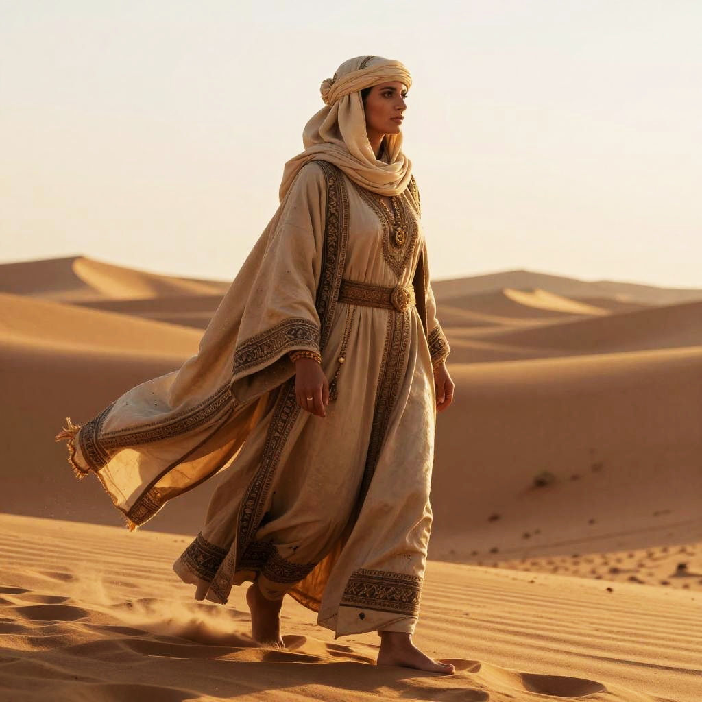 Desert garb worn by a nomadic traveler, flowing robes and headscarves, sandy dunes backdrop, golden hour lighting, intricate patterns and textures, cinematic style