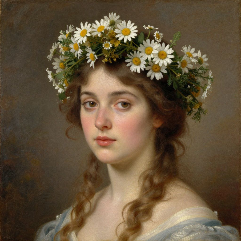 A woman adorned with a crown of flowers, including daisies, in a painting by Josephine Wall.
