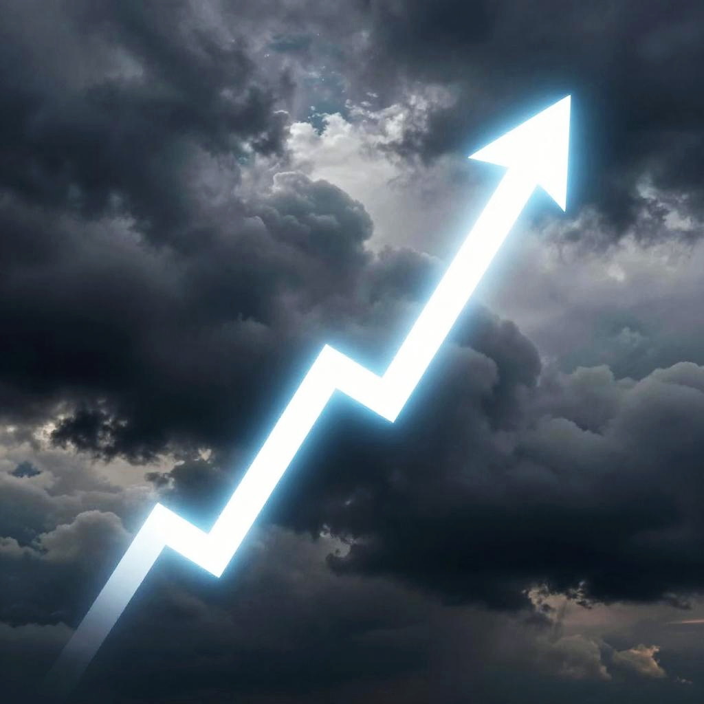 Upward trending graph depicted as glowing arrows soaring upwards through a stormy dark sky, contrasted with bright electric blue highlights and dynamic clouds, representing overcoming challenges and growth, cinematic and dramatic mood