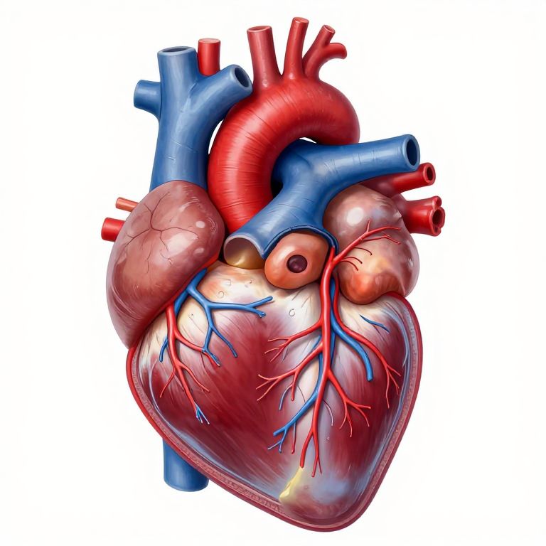 Heart anatomically correct, detailed medical illustration, realistic textures, intricate veins and arteries, vibrant red and blue tones, high resolution, scientific accuracy, cross-sectional view, soft lighting highlighting textures, educational style