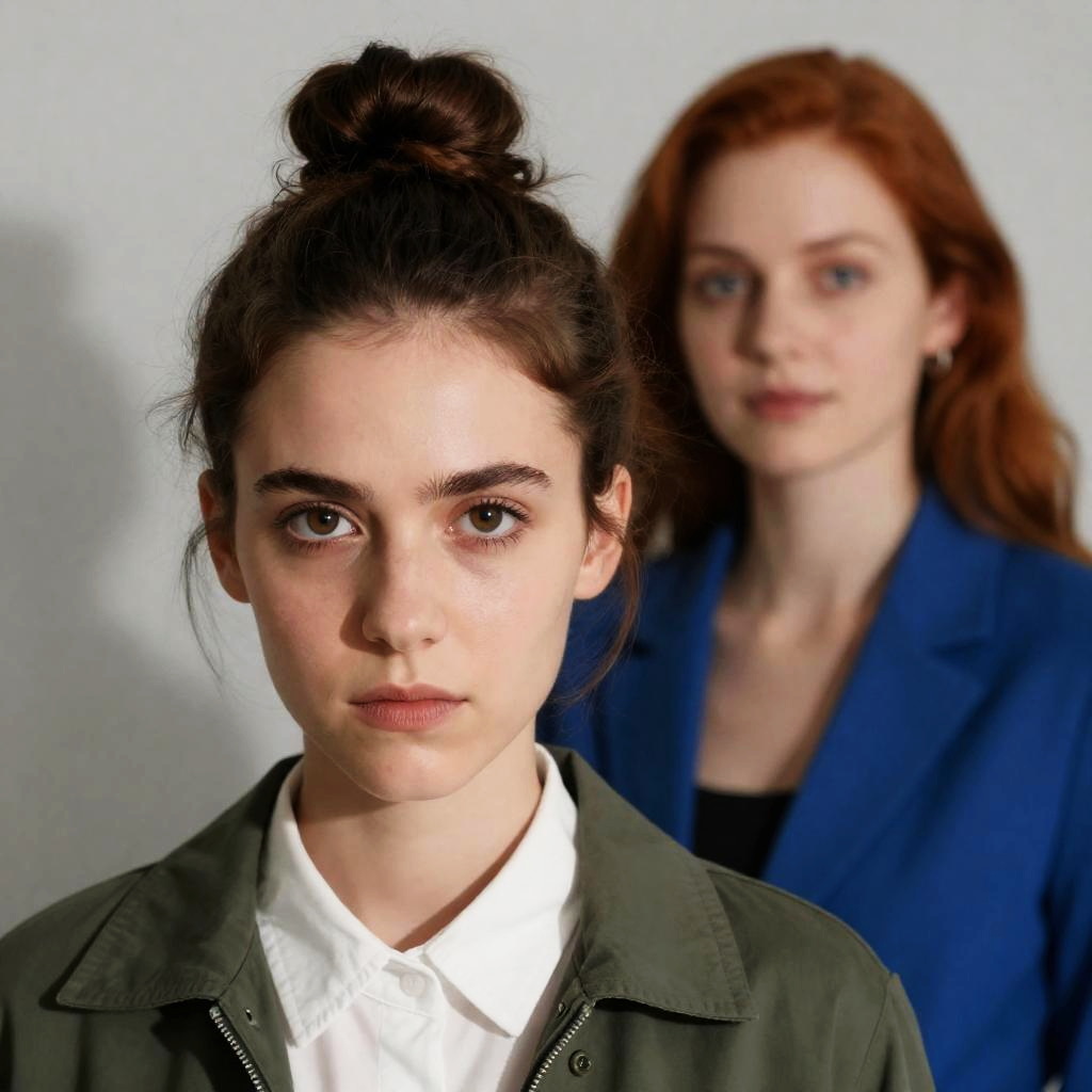 Photograph of two women. Foreground woman with light skin, brown eyes, brown hair in a bun, white collar, green jacket. Background woman with light skin, red hair, blue jacket. Shadows of camera in background. Foreground woman's intense gaze. Background woman's subtle smile.
