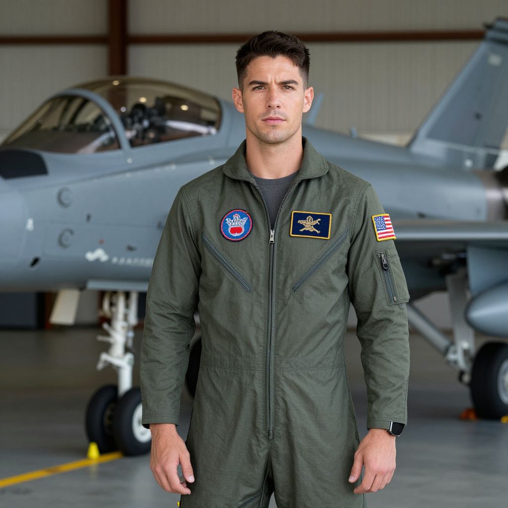 Photograph of a fit, handsome man with short, dark hair and light skin, standing in front of a military jet in a hangar. He's wearing a dark green flight suit with patches, including a round blue and red patch on the left chest and an American flag patch on the right sleeve. The jet is gray with visible landing gear and cockpit.