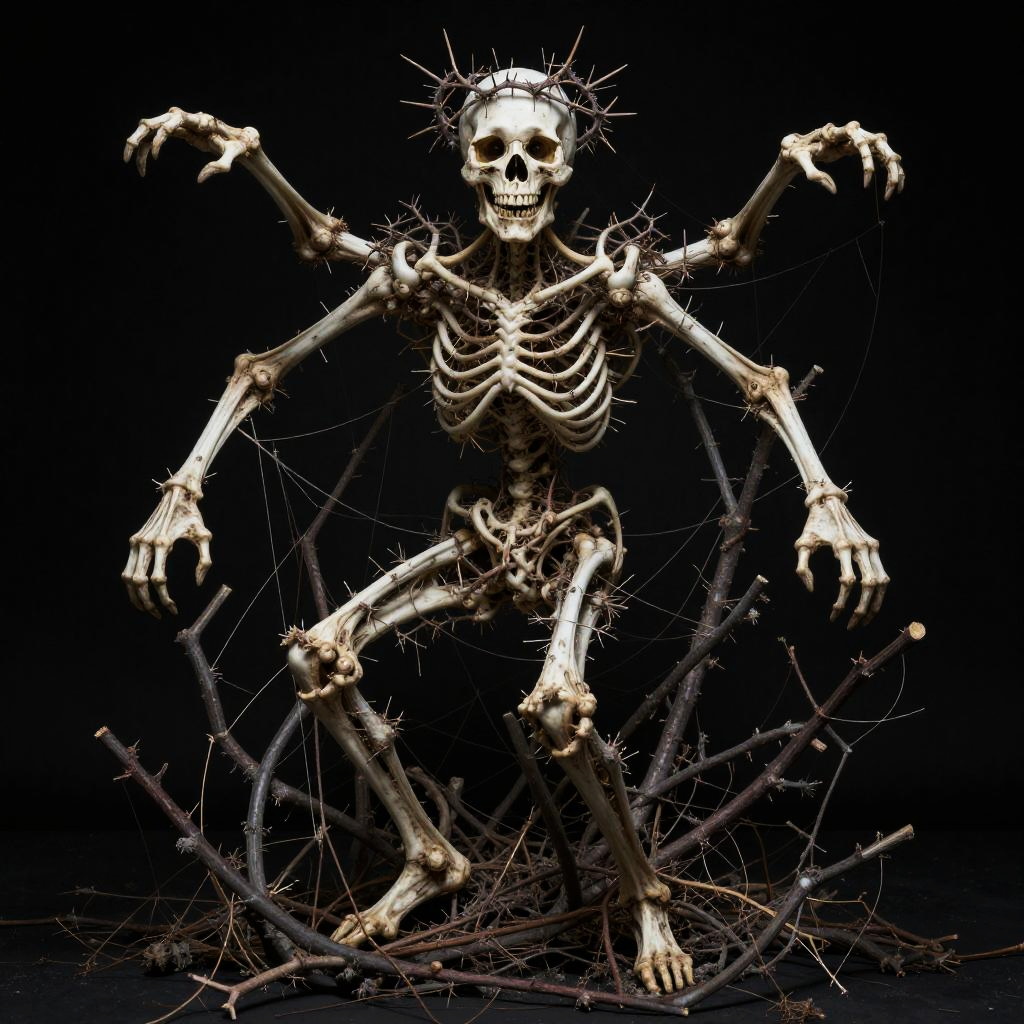 Full body, solo, writhing mass of thin limbs converging into a skull adorned with thorns, branches reaching out, teeth baring, looking at viewer, entwined within a web of darkened branches, malevolent amusement rippling beneath stillness, black background
