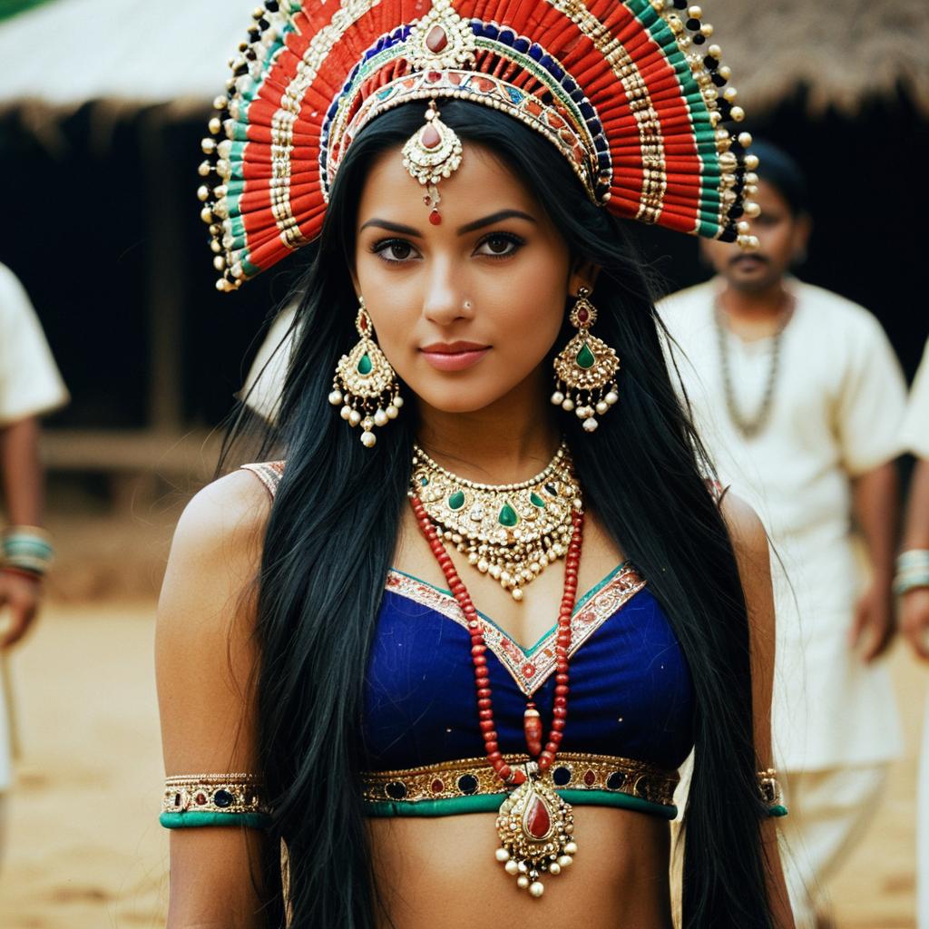 Desh bhakti costume,1girl, solo, jewelry, headdress, necklace, long hair, black hair, earrings, realistic, bracelet, blurry background, blurry, midriff