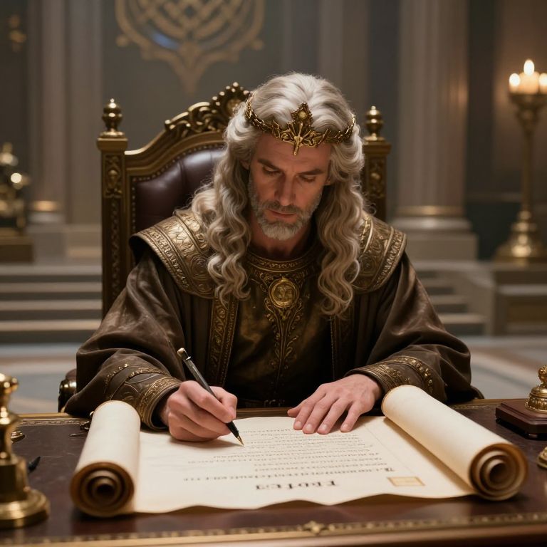 Sci-Fi show God sitting at a magnificant desk, writing his moral laws on a scroll, UHD, 8K, ultra-realistic,