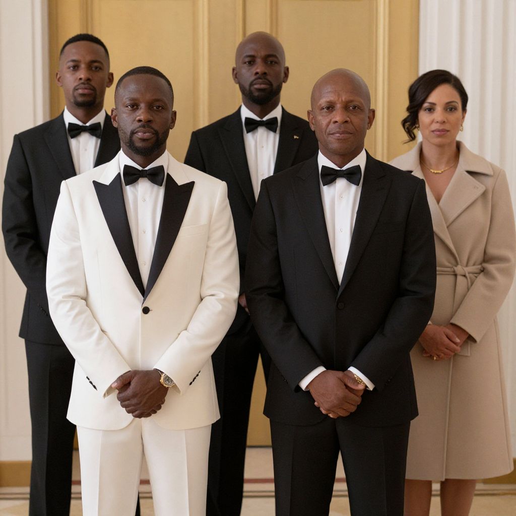 Elegant figures stand poised in formal attire, with Mr. and Mrs. Phillip Wase positioned prominently in the foreground, while three men and a woman in matching tuxedos and a beige coat observe them from behind, set against a warm-toned interior backdrop.