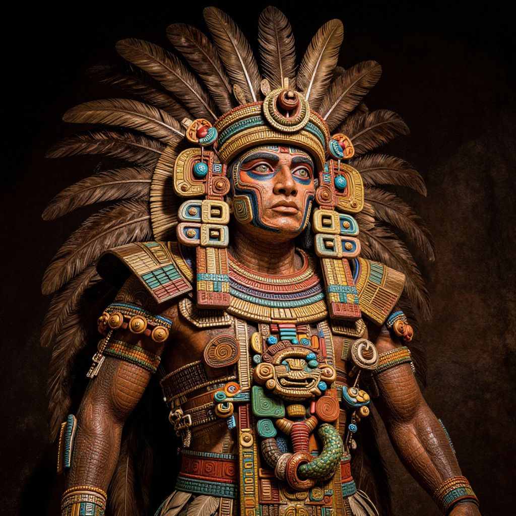 [[man,quetzalcoatl drawing]]Intricate, large-scale illustration of a man portrayed as Quetzalcoatl, the feathered serpent deity from Aztec mythology, rendered in vivid Eastmancolor hues. Richly detailed textures adorn his face, body, and regalia, with dynamic contrasts between light and dark, evoking an otherworldly aura. Serpentine Man has masculine face and piercing eyes