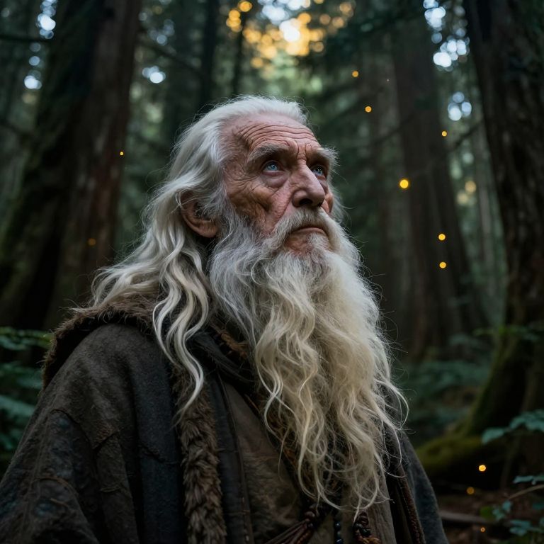 A highly detailed, super-realistic portrait of an ancient, wise old hermit stands at the edge of a dense, primordial forest. Deep wrinkles etch his face, a map of the decades of his life, framing his piercing eyes that gleam with an otherworldly knowledge. His long, white beard flows over his chest as he tilts his head, glooking intently toward an unseen distant horizon. Captured from a low angle, the composition emphasizes his solitary figure, a testament to the passage of time, against the backdrop of towering trees. The forest around him is bathed in a mysterious light, with shadows and golden embers filtering through, creating an ethereal ambiance that evokes contemplation, wisdom, and a profound sense of solitude.