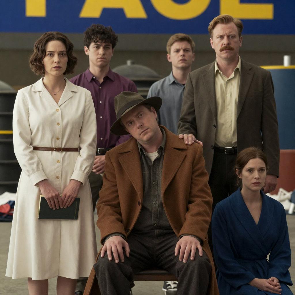 Photograph of a movie poster. Six people in various states of disarray. Central man in brown coat and hat, resting head on another man's shoulder. Woman in white dress, holding book, left. Man with mustache, standing, right. Man in purple shirt, background. Woman in blue robe, floor, right. Background shows industrial setting. Blue and yellow banner top. Scattered clothes and objects. Intense, concerned facial expressions.