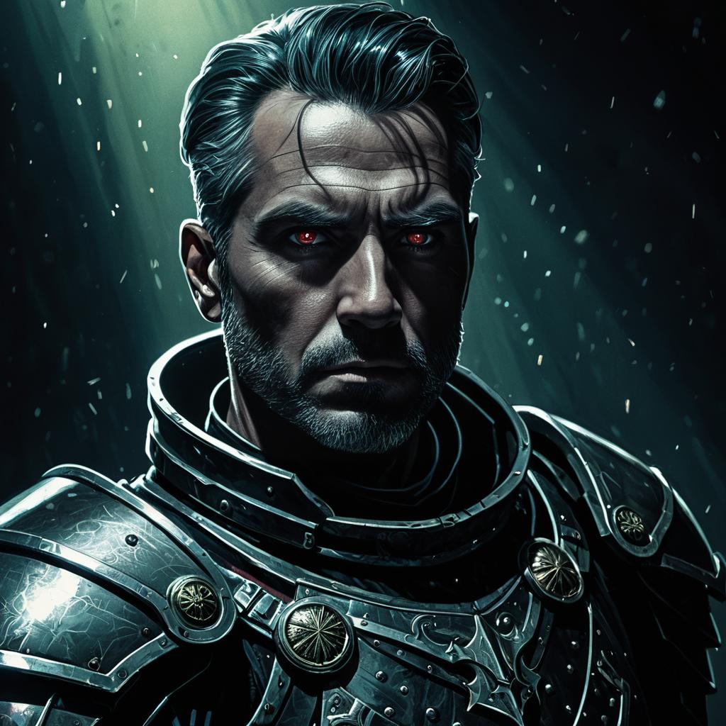 Detailed Neo-Noir illustration of a tall, large, hopeless human Echo Knight soldier with sunken eyes, black, graying hair, mature look, surrealism, deep shadows, dramatic lighting, vibrant, colorful armor, Disco Elysium, surrealism, neo-noir, deep shadows, detailed eyes, professional, dramatic lighting