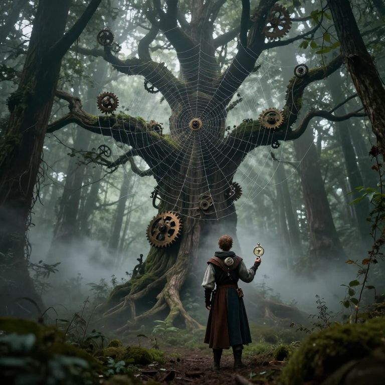 Imagine a whimsical, fog-enveloped forest viewed from an otherworldly perspective, as if seen through the intricate strands of a spider's web. In this fantastical landscape, a lone figure stands before an unusual tree that has grown into a complex fusion of nature and machinery, its branches interlaced with gears and levers. The enigmatic protagonist, dressed in attire blending medieval fashion with futuristic accents, clutches an antique compass, navigating the labyrinthine forest as swirling mist dances around them, creating a sense of intrigue and exploration that invites viewers to enter this mesmerizing world.