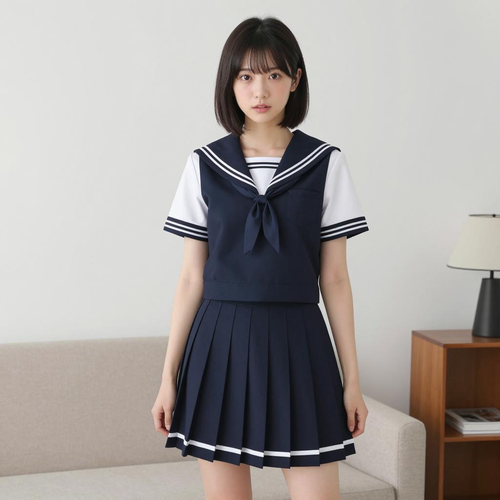 Aoyama Sumika poses confidently in a stylish navy blue and white sailor-inspired outfit with a fitted bodice and pleated skirt. The image highlights her short black hair and subtle makeup, emphasizing a clean and modern aesthetic in a well-lit indoor setting.