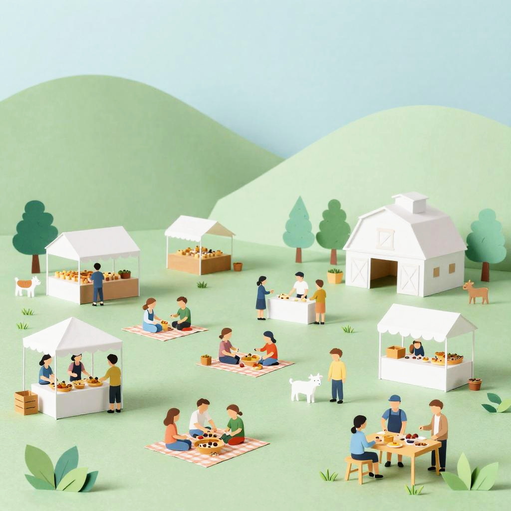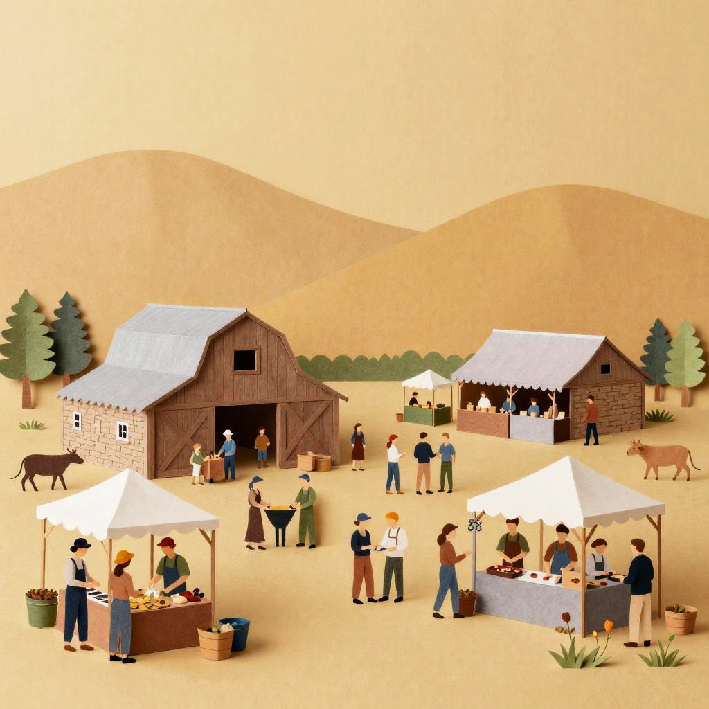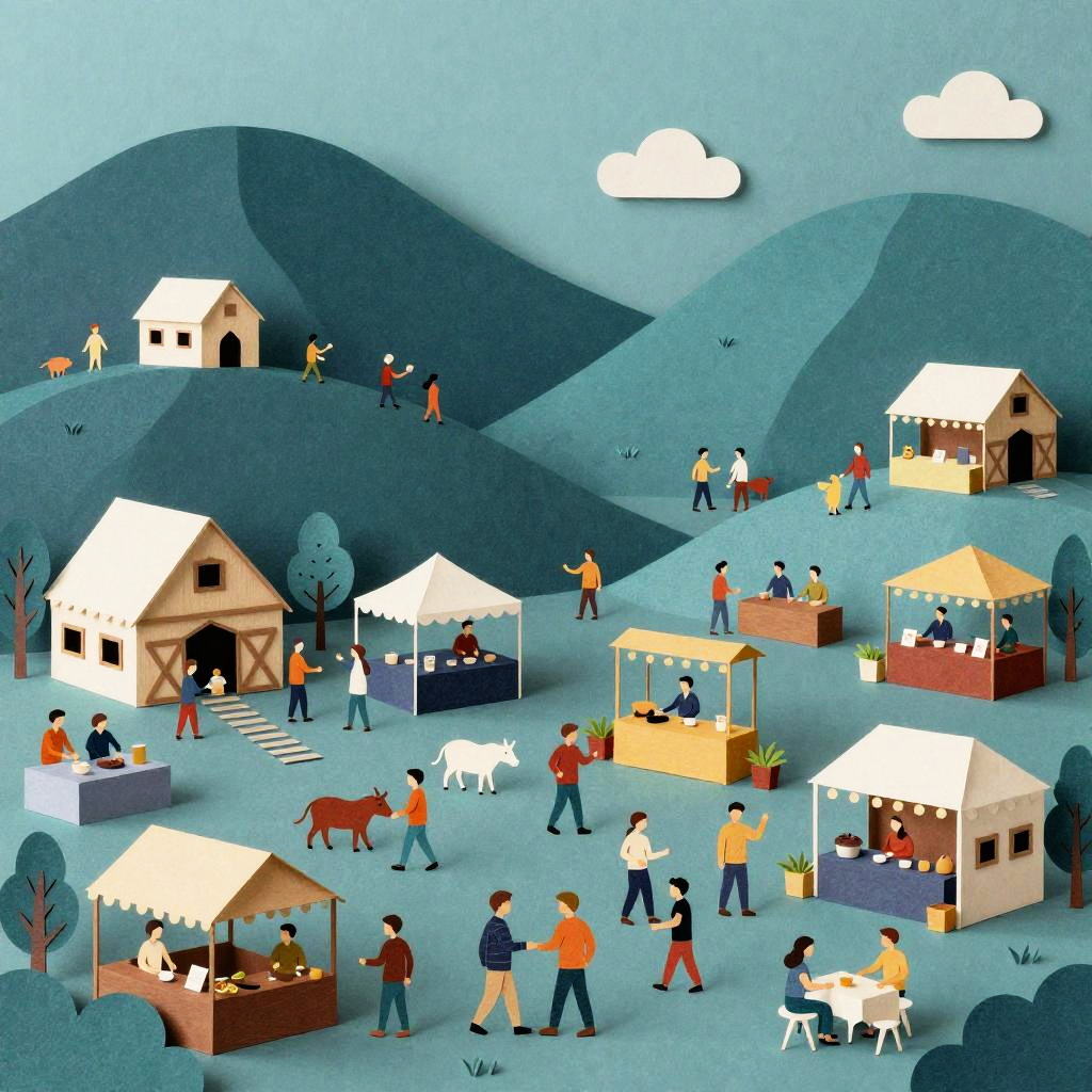 A paper cut collage of hundreds of families in celebration at a festival on a farm ontop of fluttering lavender hills. The farm is situated on two fluttering lavender hills, and there are several open vintage barns. The festive environment has people and vendors and animals all enjoying their time together. the scene is heartwarming and sunny. the scene is built from construction paper.