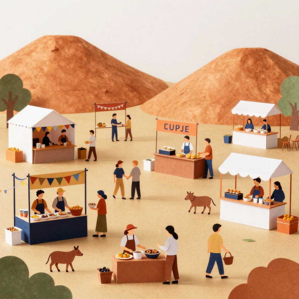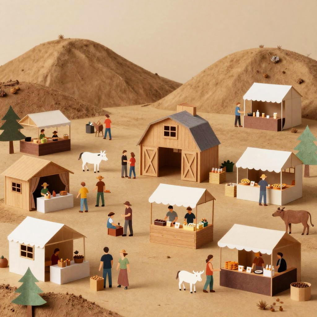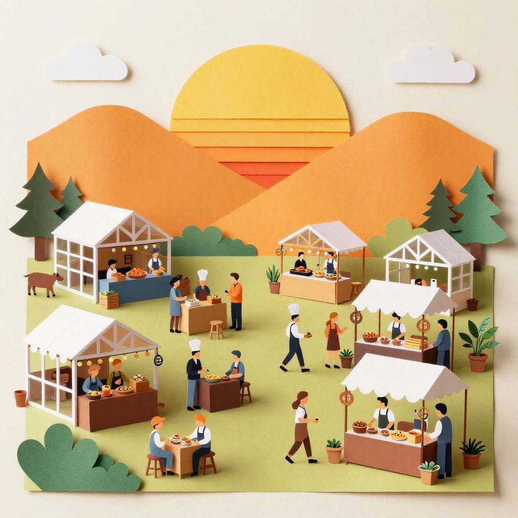 A paper cut collage of hundreds of families in celebration at a festival on a farm ontop of fluttering lavender hills. The farm is situated on two fluttering lavender hills, and there are several open vintage barns. The festive environment has people and vendors and animals all enjoying their time together. the scene is heartwarming and sunny. the scene is built from construction paper.
