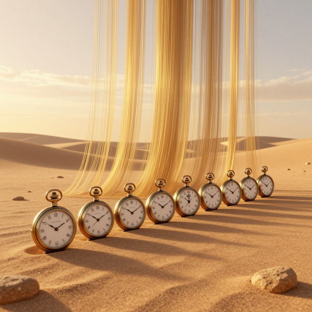 A surreal 3D-rendered scene depicts a desert landscape where cascading threads of golden hours form the sand, with a row of vintage pocket watches lined up, each displaying a different time, creating a mesmerizing blend of retro elegance and futuristic abstraction.