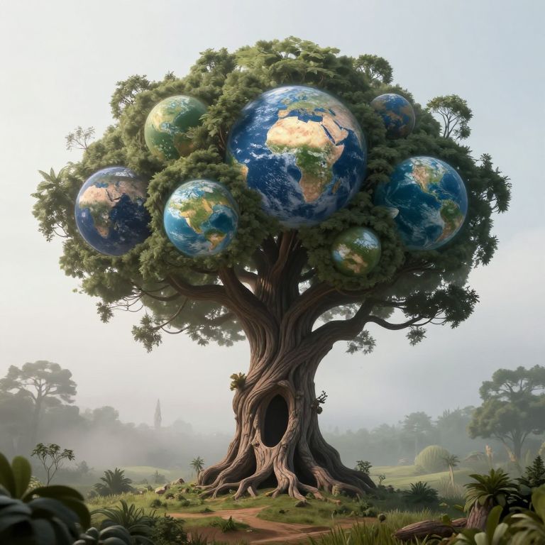 A digitally rendered, surreal landscape features a majestic, corkscrew-shaped tree with a hollow trunk, evoking a fantastical narrative where its chambers connect parallel worlds with contrasting climates and eras, set against a misty, ethereal backdrop.