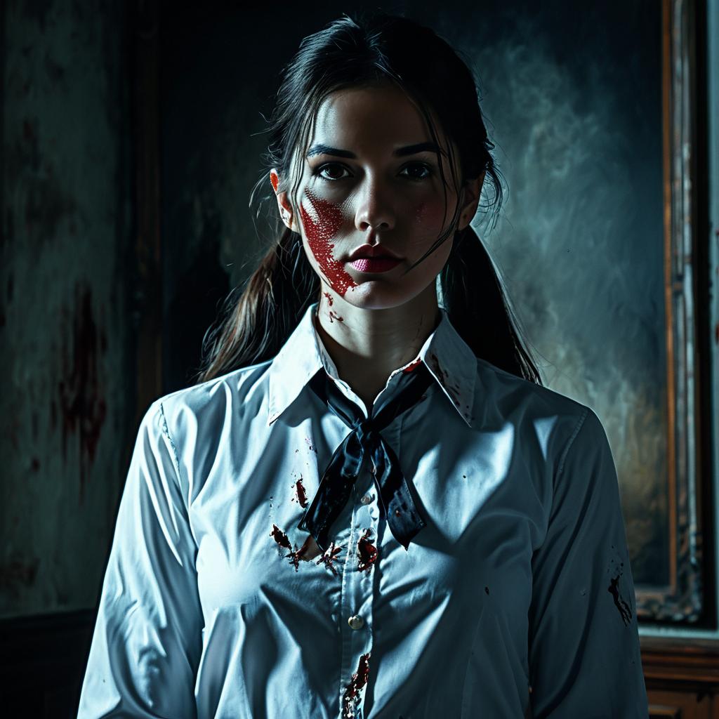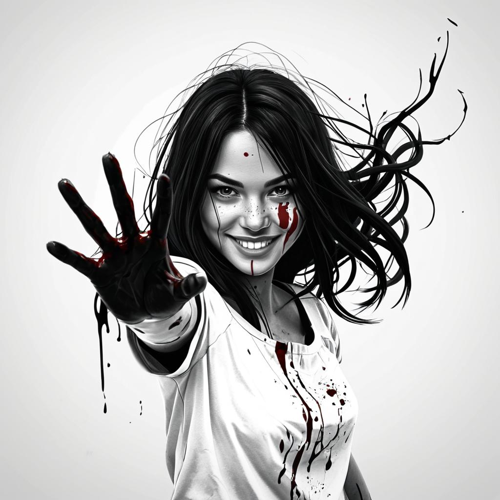 1girl, solo, looking at viewer, smile, simple background, white background, monochrome, greyscale, blood, floating hair, clenched hand, veins, incoming attack