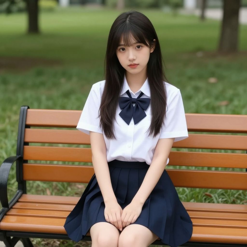 Digital anime-style photograph of a young Japanese girl in a school uniform, sitting on a wooden bench in a sunlit, tree-lined schoolyard.