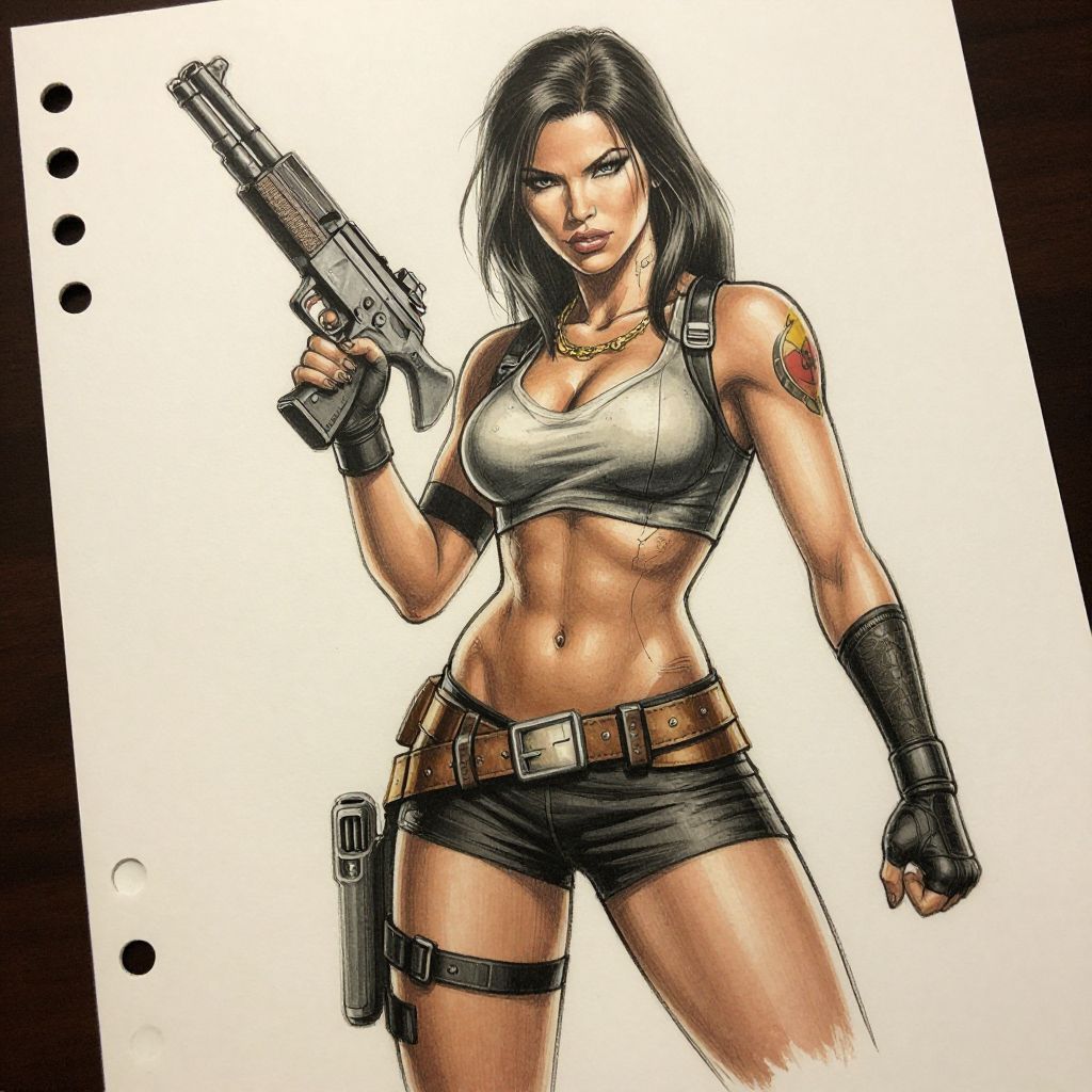 A tattooed woman in a revealing outfit holds a machine gun, depicted in a sketch drawing style reminiscent of Todd McFarlane's work, with accent lighting and a telephoto lens effect.