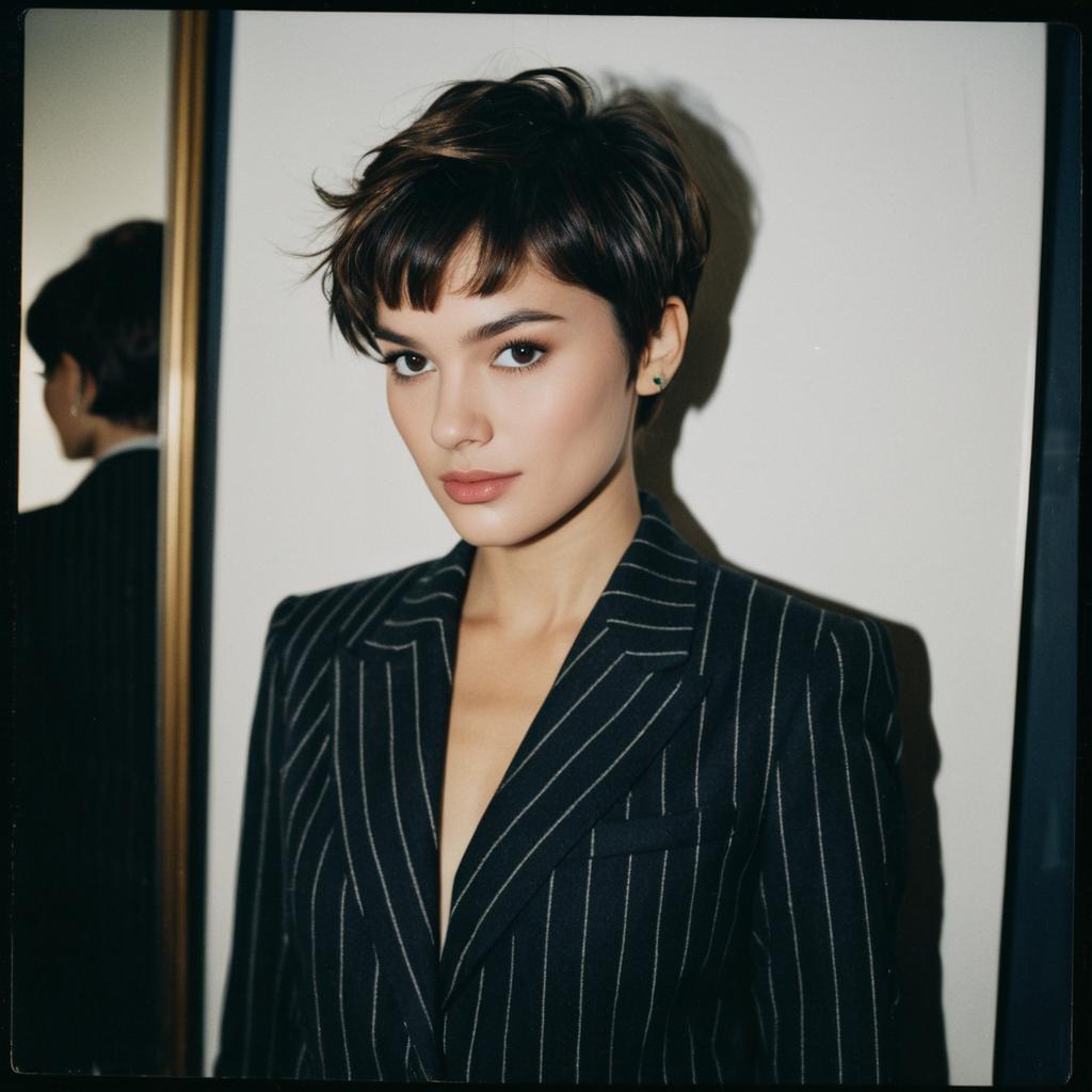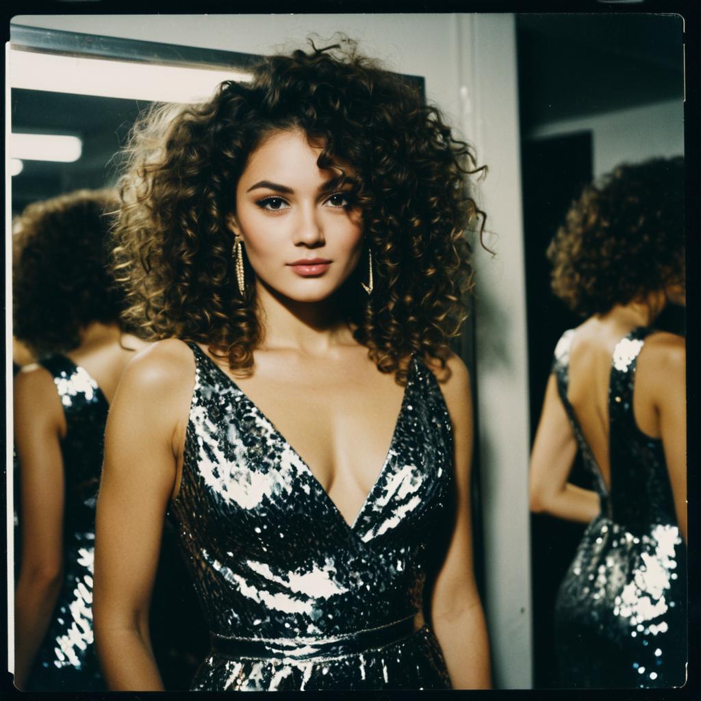Dynamics, a printed Polaroid of a elegant 29-year-old woman with smokey eye makeup and loose tousled waves as a model backstage at a high fashion show, hanging on a wall near a mirror, high quality, high resolution, sharp focus, cinematic, moody, cinematic film still