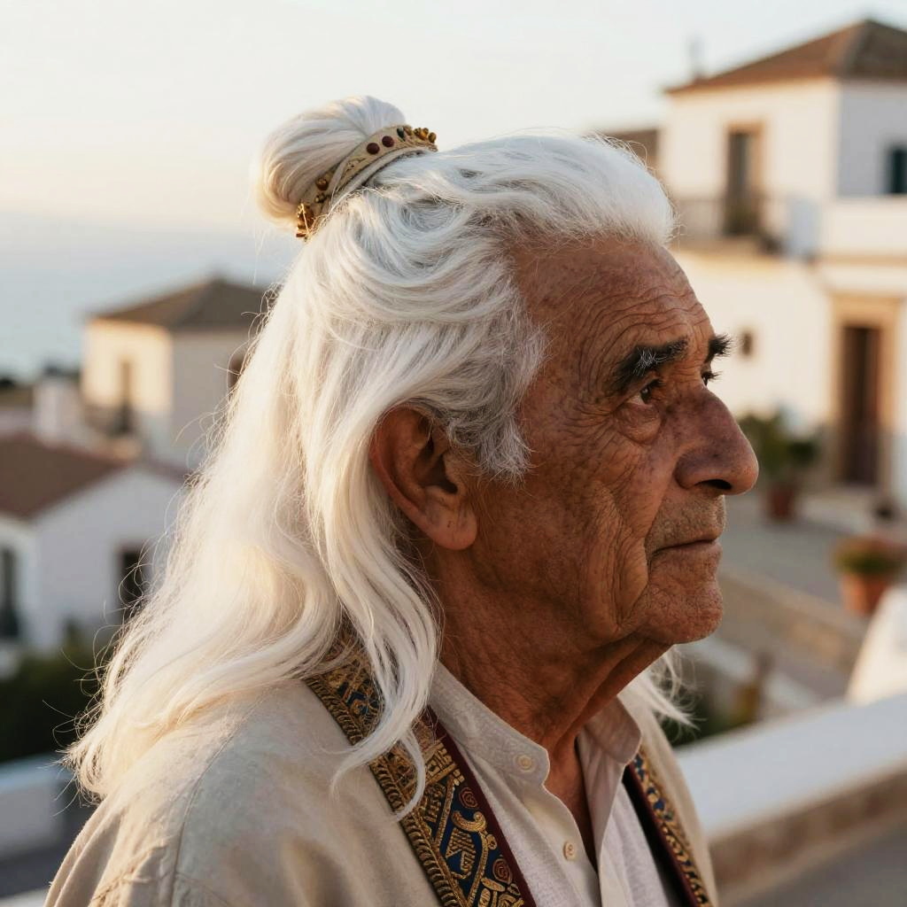 White hair in Spanish culture, an elderly person with striking white hair styled traditionally, surrounded by a warm Mediterranean village scene, soft golden sunlight, intricate textures in hair and clothing, cinematic and vibrant lighting