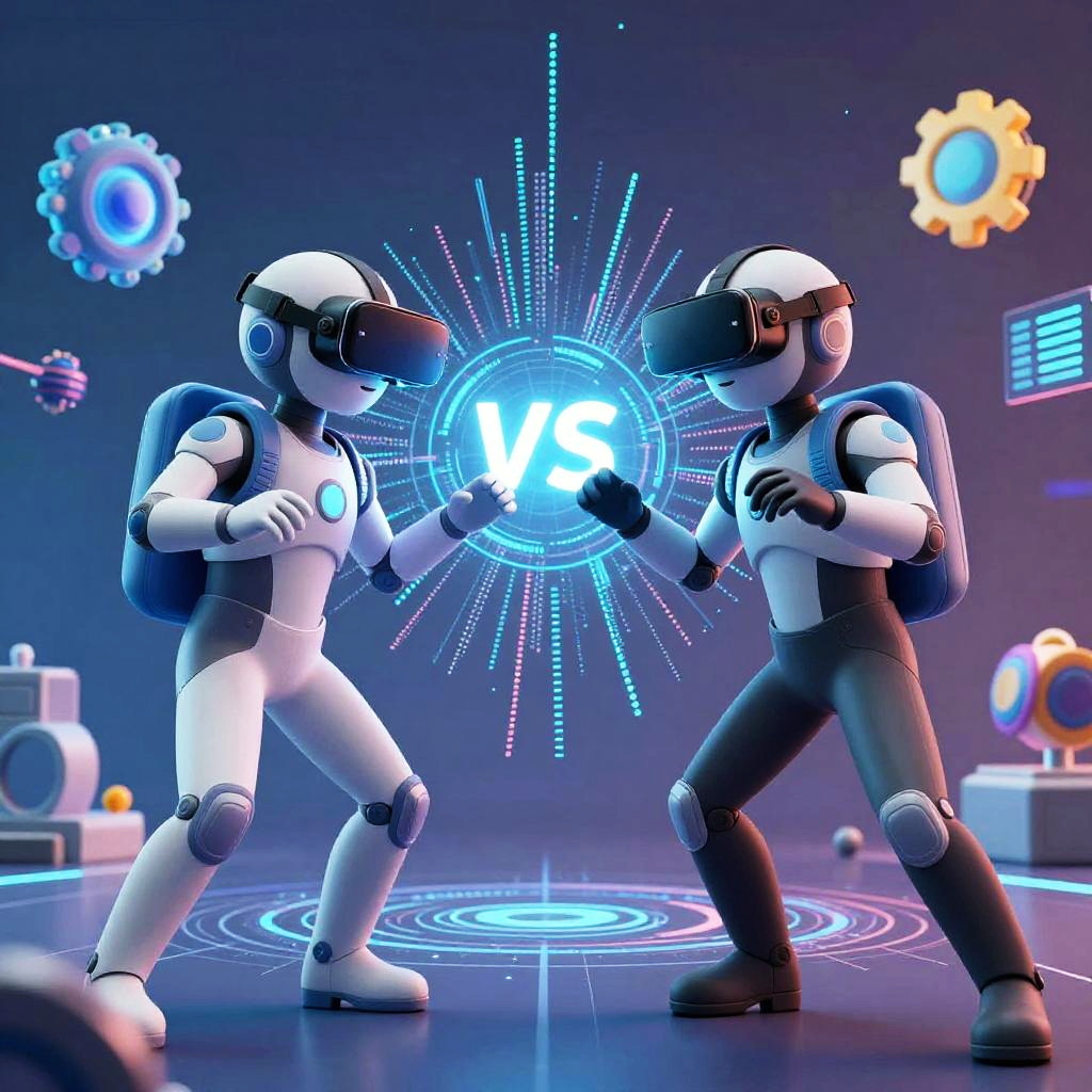 Dalle2 vs stable diffusion, imaginative scene depicting two AI avatars competing in virtual reality, surrounded by floating 3D models and dynamic data waves, futuristic interface elements, energetic atmosphere, bright contrasting colors, emphasizing technology and creativity