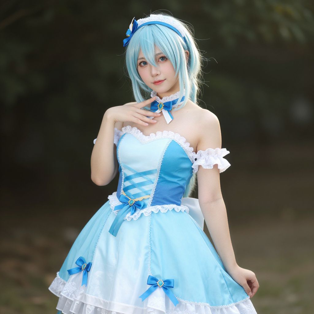 Photograph of an East Asian woman with pale skin and light blue, shoulder-length hair, wearing a blue and white cosplay outfit resembling a fairy or magical girl. She has blue eyes and is adorned with a matching blue headband with a bow. Her outfit features a strapless, blue satin bodice with white lace trim, a white frilled skirt with blue bow accents, and a blue ribbon choker. She stands outdoors in a dimly lit forest, with dark green foliage in the background, and her right hand gently touches her chin while looking at the camera with a slight smile.