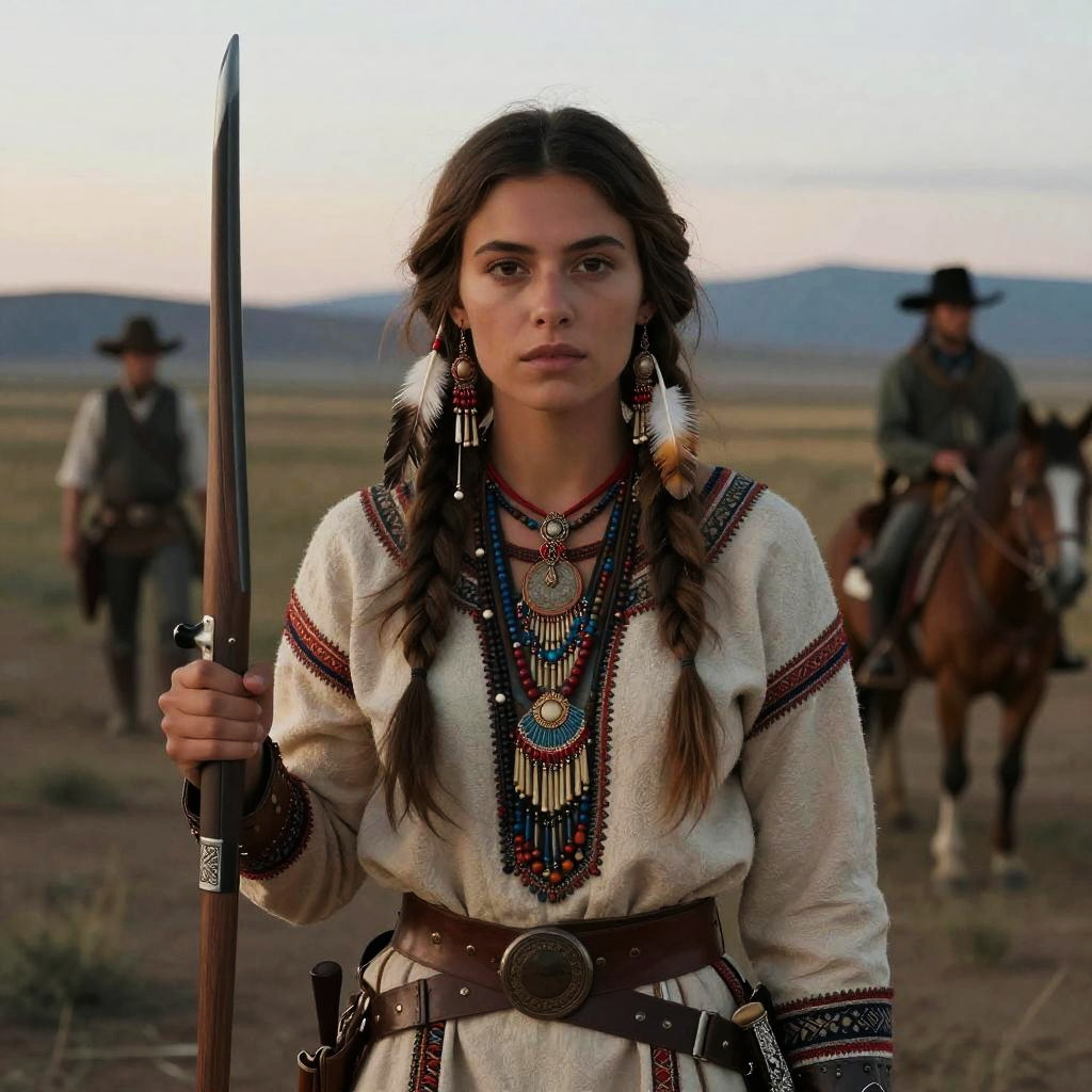 Portrait of a young Native American woman wearing traditional handmade dress with intricate beadwork and feather jewelry. She holds a spear and stands confidently in a wild west environment resembling a Utah landscape at dusk. The woman has braided hair and a serious expression, with two cowboys visible in the blurred background, one on horseback. The scene features soft ambient lighting and a professional color grading, highlighting the detailed traditional attire and natural outdoor setting.