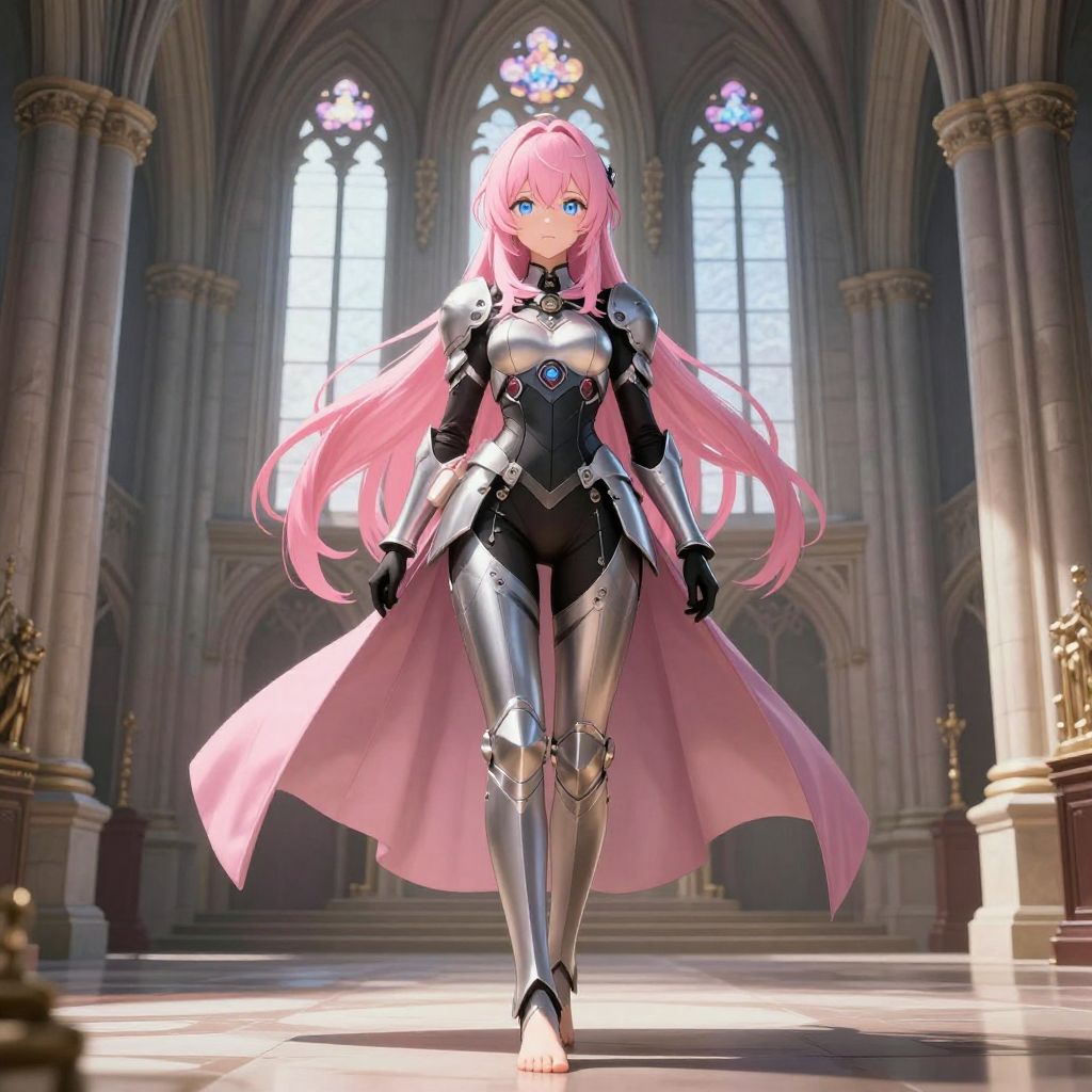 Digital anime-style drawing of a pink-haired woman with blue eyes, standing confidently in a grand, gothic cathedral with tall, arched stained-glass windows. She wears a black and silver armored suit, including a corset, gauntlets, and boots, with a flowing pink cape. Her long hair cascades down her back. The cathedral's stone columns and ornate details are illuminated by sunlight. She stands barefoot on a polished stone floor, with gold accents visible on the altar to her right. The overall scene is bright and dramatic, highlighting her as a central, powerful figure.