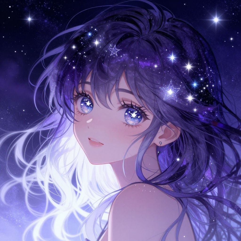 Digital anime illustration of a young girl with glowing blue eyes, star-filled dark purple hair, and luminous white hair, set against a cosmic night sky