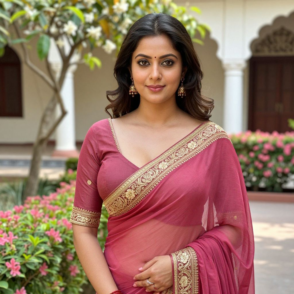 A beautiful Indian woman with soft brown skin, warm brown eyes, and a gentle smile wearing a traditional georgette saree in deep rose color, styled with a decorative gold border and elaborate embroidery, standing in a sunlit courtyard in a heritage-style Indian home with jasmine vines and pink hedges in the background.. The woman has big tits and cute face