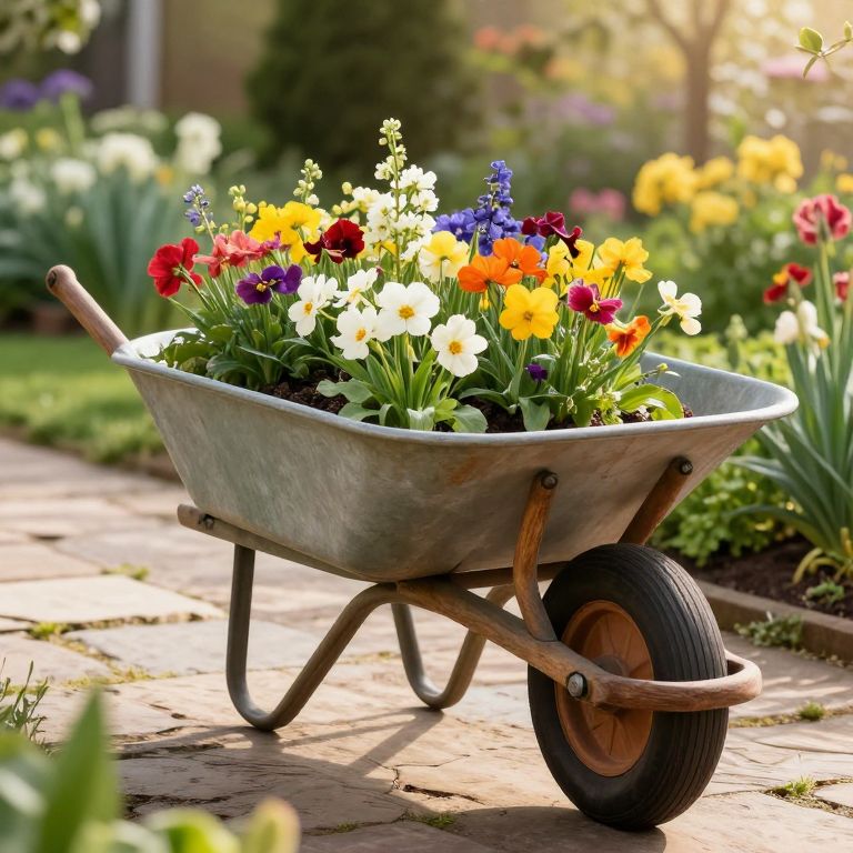 Wheelbarrow filled with vibrant spring flowers, rustic wooden handles, set in a sunny garden with soft morning light, surrounded by blooming plants and a weathered stone path, detailed texture and warm inviting atmosphere.