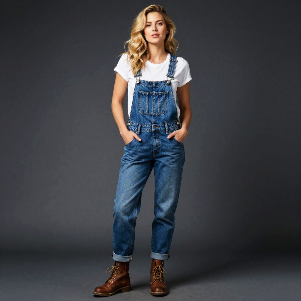 Photograph of a blonde woman with wavy hair, standing against a dark gray backdrop. She's wearing blue denim overalls with rolled-up cuffs, a white t-shirt, and brown lace-up boots. Her hands are casually in her overalls' pockets, and she's looking directly at the camera with a relaxed expression. The lighting highlights her casual, rustic style.