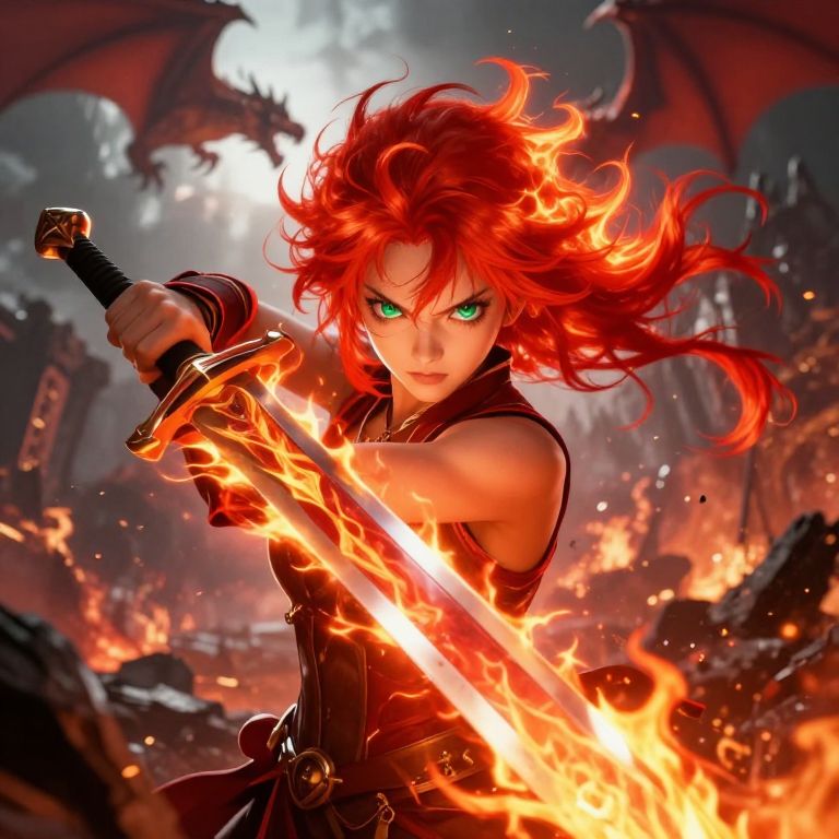Fantasy anime girl with fiery red hair and emerald green eyes, wielding a gleaming sword engulfed in flames, fierce expression against a backdrop of a war-torn fantasy battlefield with dragons soaring overhead, dramatic and intense ambiance.