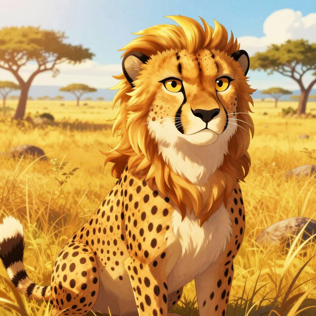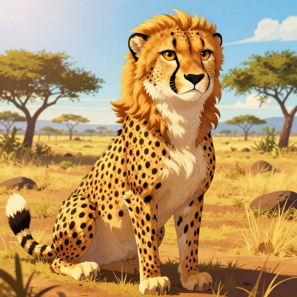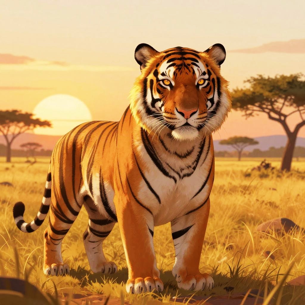Cartoon style illustration of a majestic Bengal tiger, radiant sunlight, lush golden savanna sunset, vibrant and warm color palette, detailed mane with golden highlights, confident and regal expression, high-quality, detailed fur, cartoon, vibrant colors, detailed mane, landscape, radiant sunlight, confident expression, highres, warm color palette, professional lighting