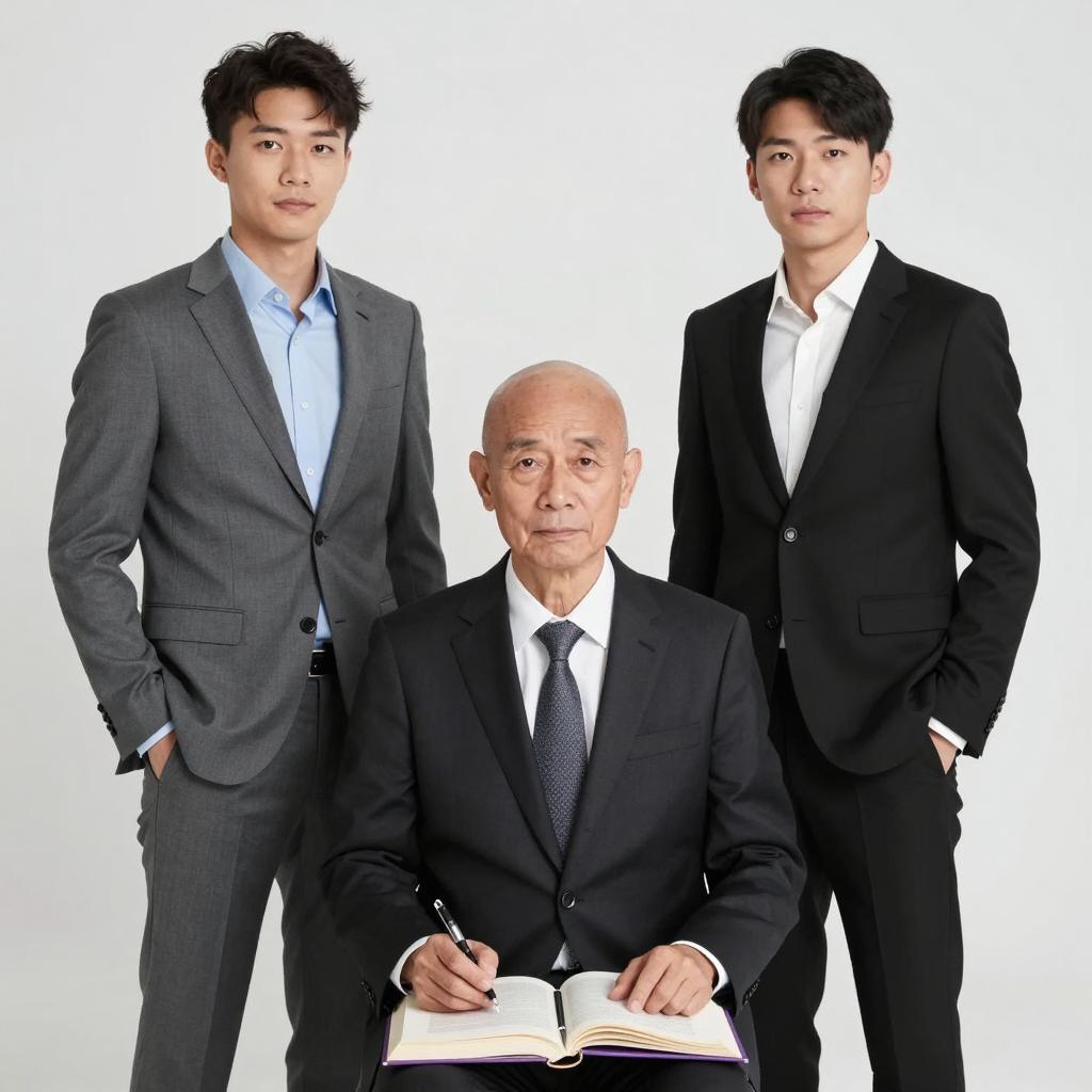 Three men in suits, white shirts, and ties. Central man bald, middle-aged, seated, dark suit, patterned tie, hands on books. Left man younger, standing, grey suit, light blue shirt. Right man younger, standing, black suit, white shirt. White background, grey gradient floor. Central man's hands on books, pens, and a purple item. All men have serious expressions.