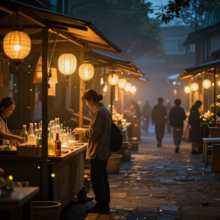 Warm golden lights from hanging lanterns and glowing glass bottles illuminate a cozy nighttime marketplace, where a solitary figure stands before a wooden stall, surrounded by flickering fireflies and the soft murmur of distant figures in the misty alley beyond.