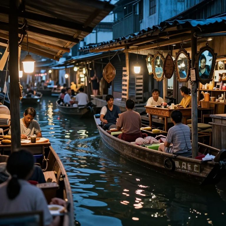 Photograph of a dimly lit, evening Asian market street with warm lanterns, two vendors, and blurred pedestrians, surrounded by wooden stalls and mist
