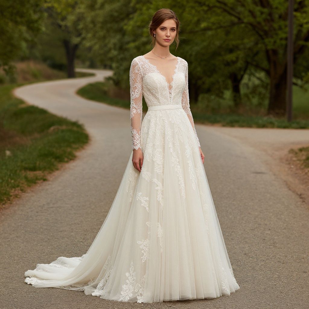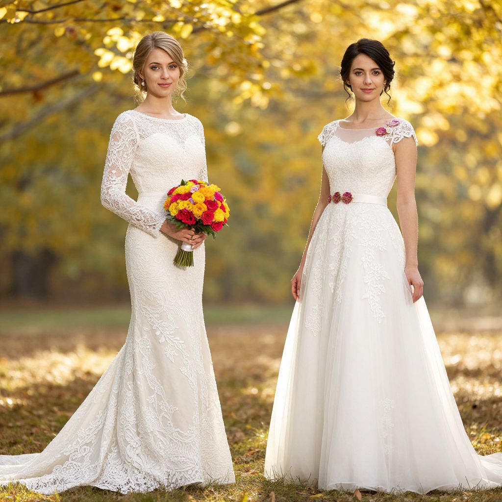 Elegant bridal portraits capture two distinct wedding styles, featuring a long lace gown with a vibrant bouquet and a shorter lace dress with delicate floral accents, set against a serene autumn backdrop of golden leaves and soft sunlight filtering through trees.