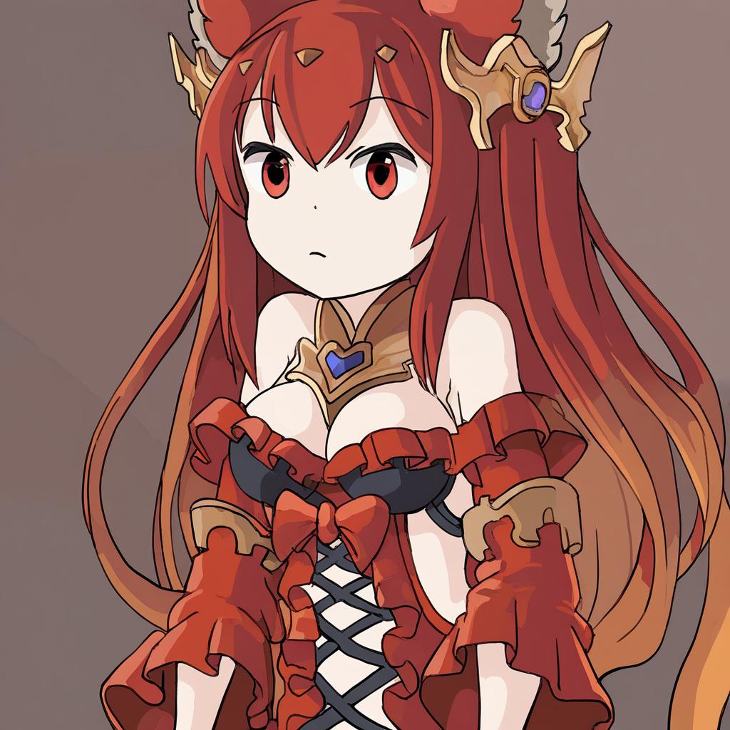Anthuria, granblue fantasy, 1girl, animal ears, red eyes, hair between eyes, red hair, long hair, hair ornament, medium breasts, large breasts, cleavage, bare shoulders, detached sleeves, erune, by artist sixten, leet